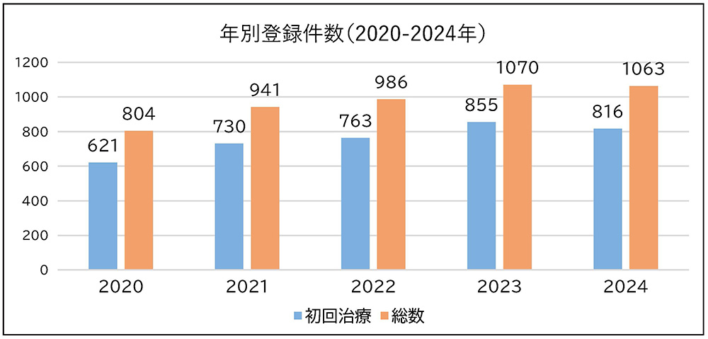 がん登録の件数を年別で表わしたグラフです。登録件数は2024年は前年よりやや減少しましたが2023年以降1000件を超えています。