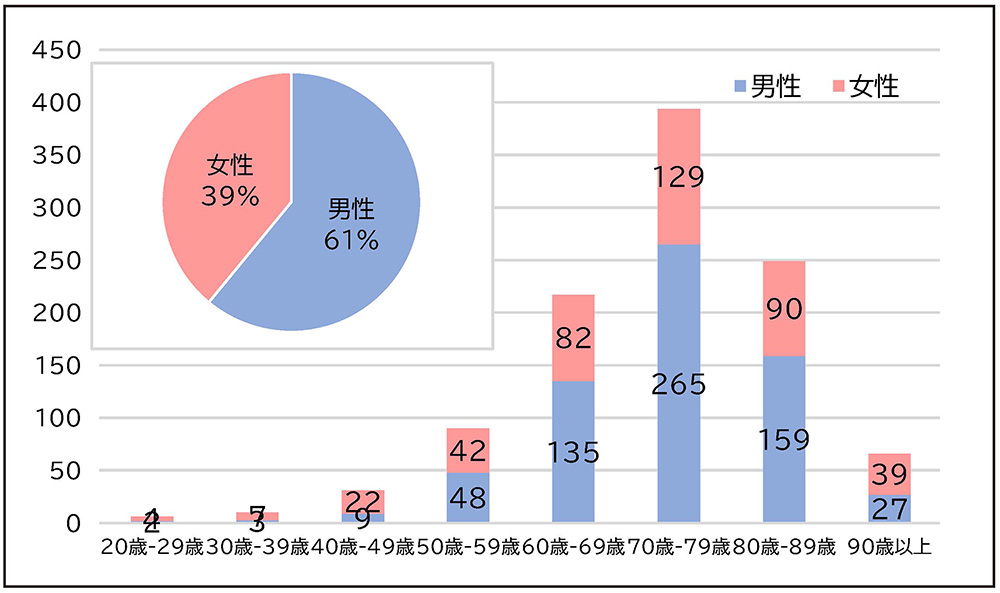 年代別では、70代が最も多く次に80代、70~80代で全体の約6割を占めています。