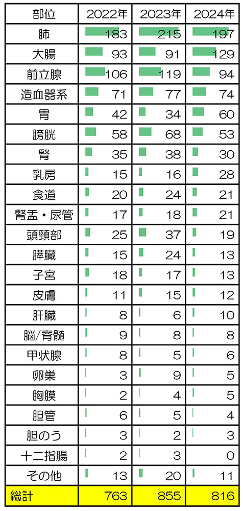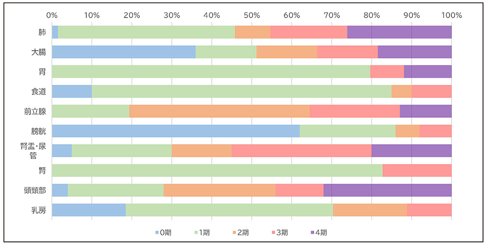 肺、前立腺、腎盂、尿管、頭頸部がんは2期以上の症例が半数を占めます。