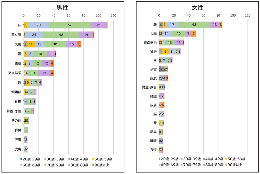 男性は、次いで前立腺、大腸が多く、女性は大腸、造血器の順です。