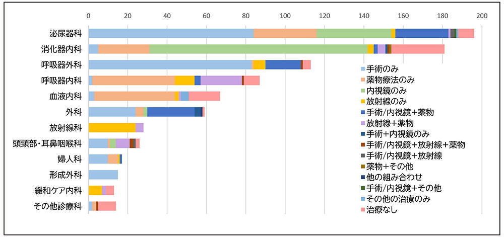 診療科別の治療数をみると泌尿器科が最も多く、消化器内科、呼吸器外科となっています。