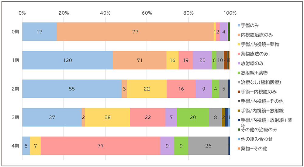 0期や1期の早期がんは、手術や内視鏡切除の実施割合が高く、がんを完全に切除することを目的として治療を行います。