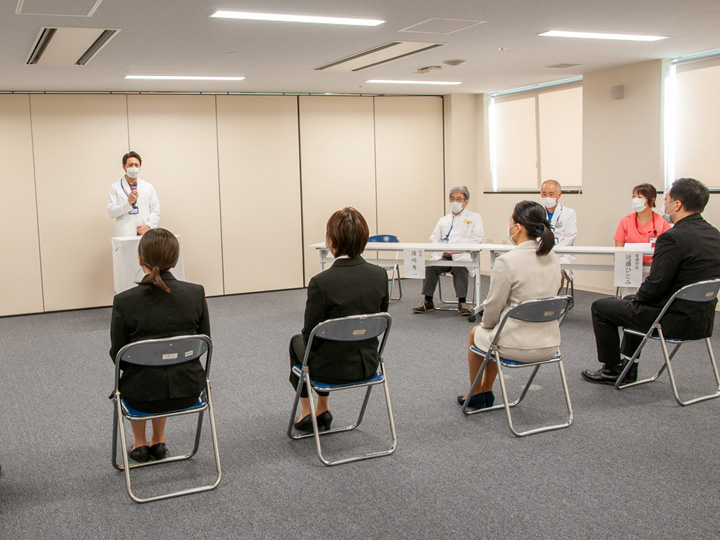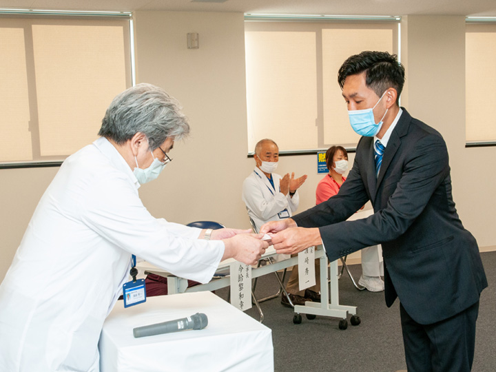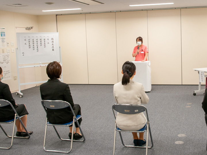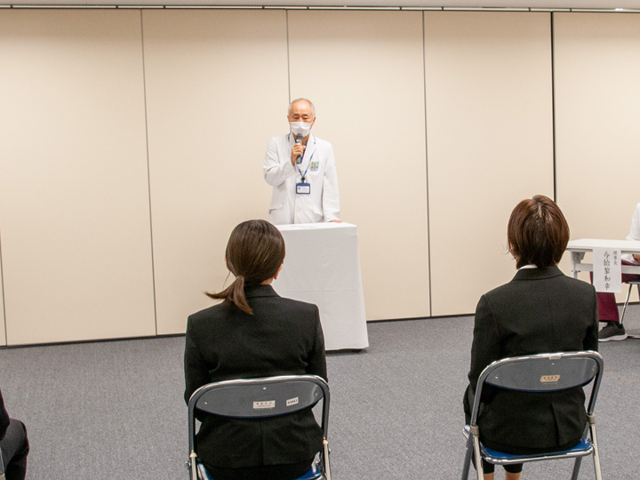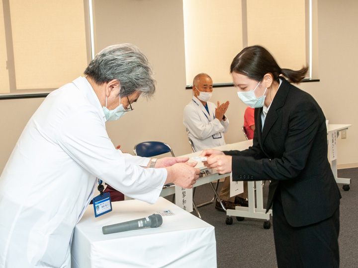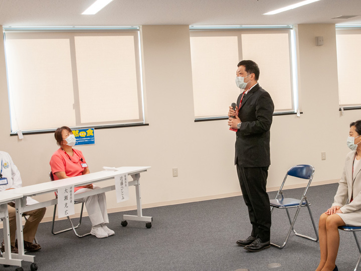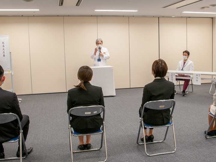 10月1日の開講式では、理事長、院長、看護部長に加え、研修責任者と関連スタッフも出席し、5名の受講者を迎えての開催となりました。まず理事長から受講者に対し、看護師特定行為研修の意義と受講者への期待・励ましの挨拶があり、引き続き院長、看護部長、研修責任者の挨拶が行われました。そして5名の受講者がそれぞれに特定行為研修に寄せる思いや決意を述べた後、濱崎院長から受講証が渡され式を終了しました。