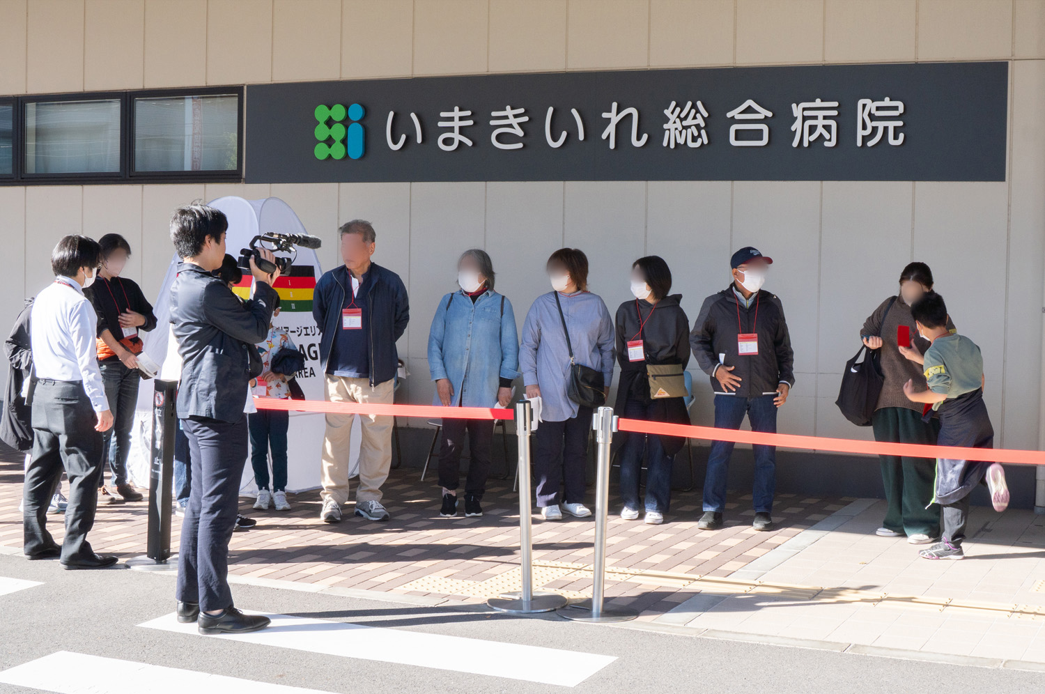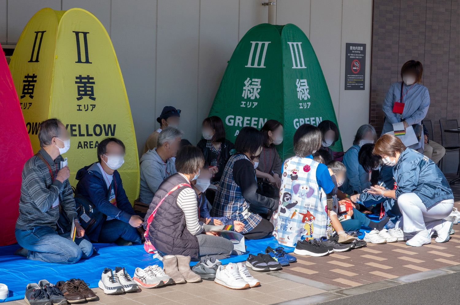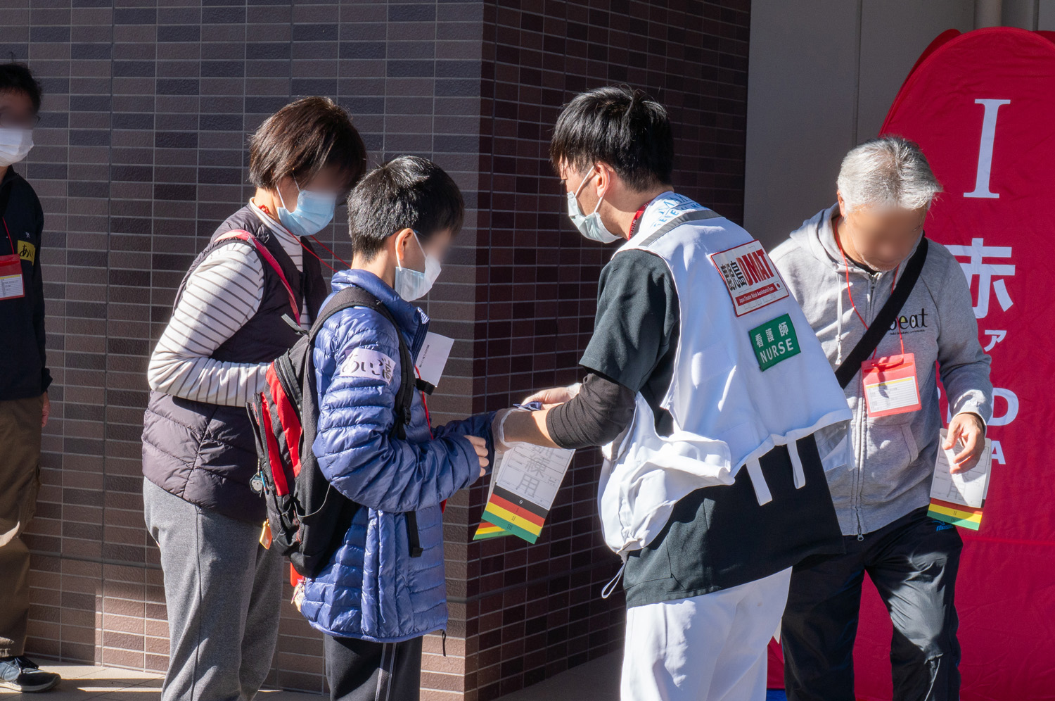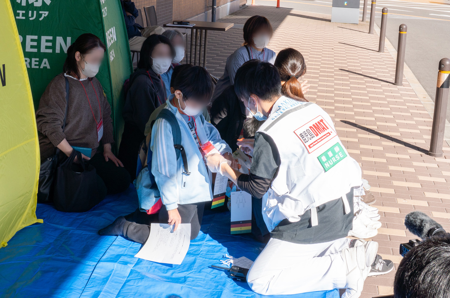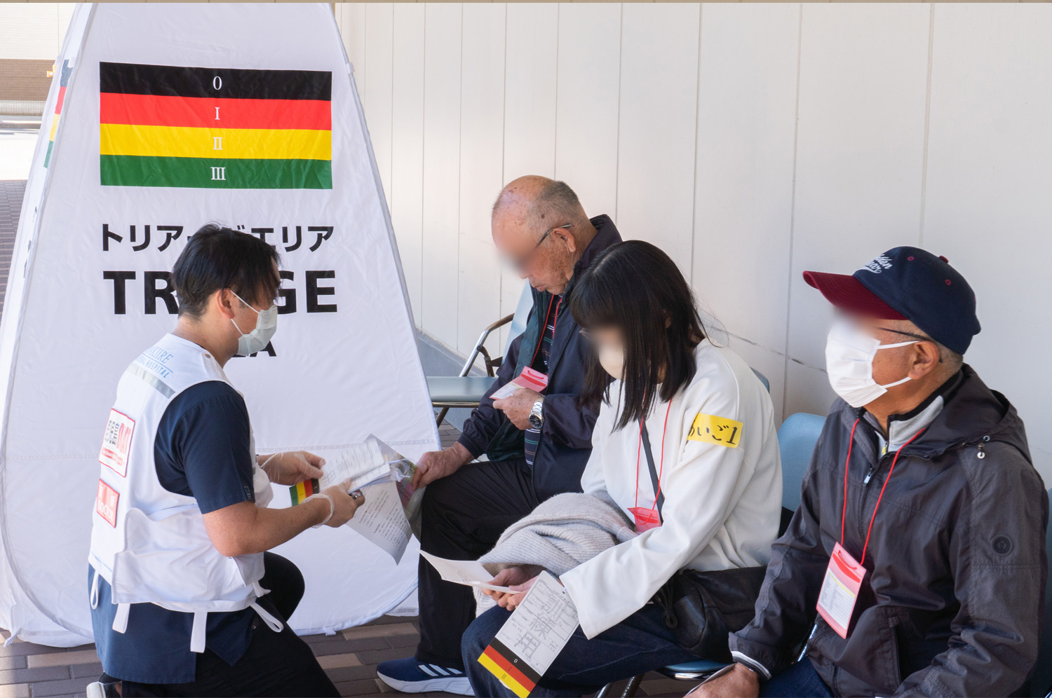 正面玄関で、緑タグ(軽症)、黄色のタグ(中等症)、赤色タグ(重症)でトリアージを行いました。